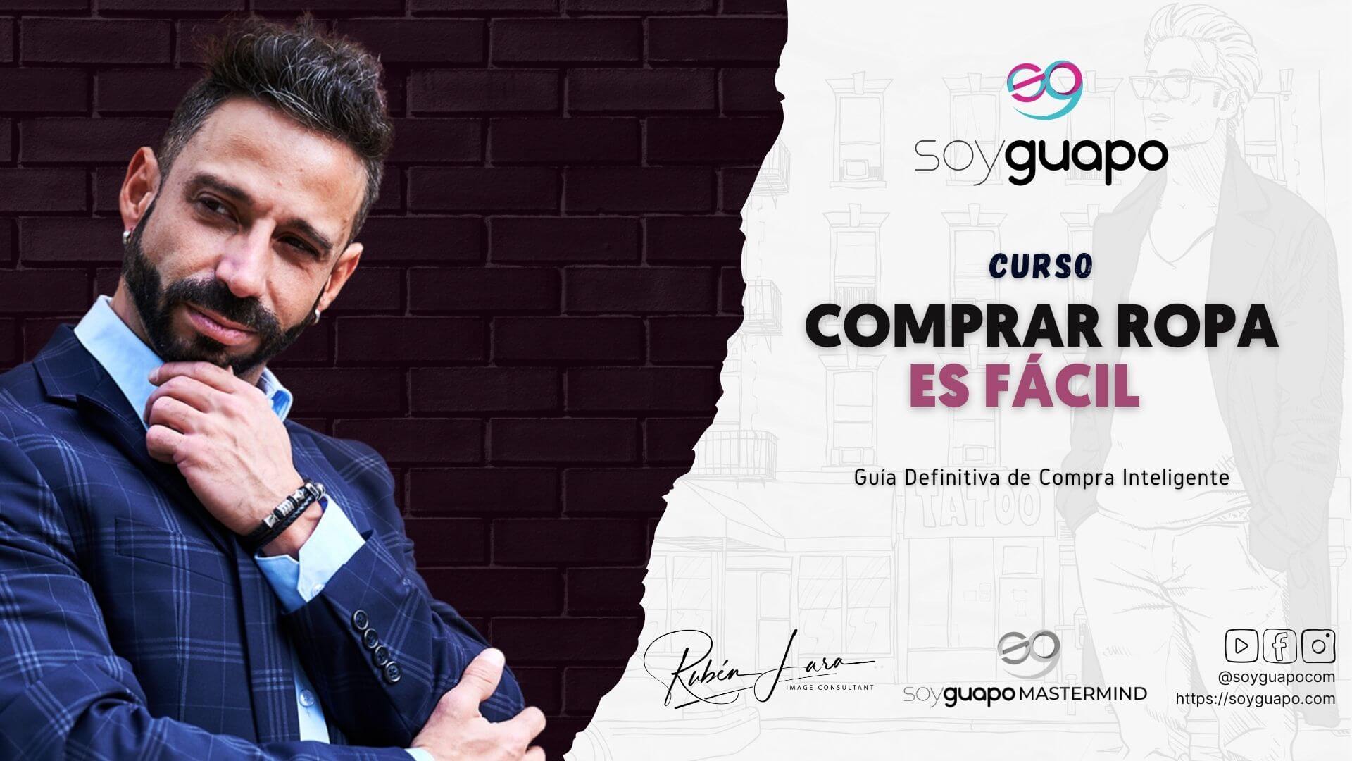 Rubén Lara en traje a cuadros junto a una pared con un texto que promociona el curso Comprar Ropa es Fácil. Incluye logotipo y perfiles de redes sociales.